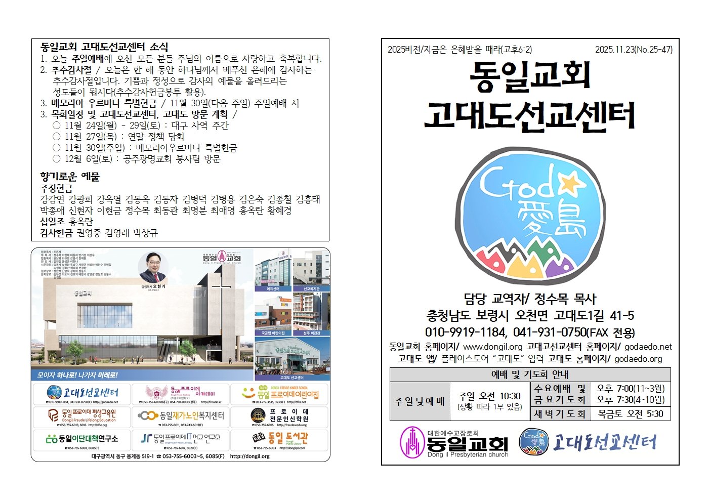2025년 11월 23일 제25-47호(추수감사절)최근소식 / 글쓴이 고대도 선교센터장 Related posts:2025년 11월 30일 제25-48호2025-11-292025년 11월 16일 제25-46호2025-11-152025년 11월 09일 제25-45호2025-11-082025년 11월 02일 제25-44호(행복온데이축제)2025-11-012025년 10월 26일 제25-43호(종교개혁기념주일)2025-10-252025년 10월 19일 제25-42호2025-10-182025년 10월 12일 제25-41호2025-10-112025년 10월 05일 제25-40호2025-10-042025년 09월 28일 제25-39호2025-10-042025년 09월 21일 제25-38호2025-09-202025년 09월 14일 제25-37호2025-09-132025년 09월 07일 제25-36호2025-09-062025년 08월 31일 제25-35호2025-08-302025년 08월 24일 제25-34호2025-08-232025년 08월 17일 제25-33호2025-08-162025년 08월 10일 제25-32호2025-08-092025년 08월 03일 제25-31호2025-08-022025년 07월 27일 제25-30호2025-07-262025년 07월 20일 제25-29호2025-07-192025년 07월 13일 제25-28호2025-07-19